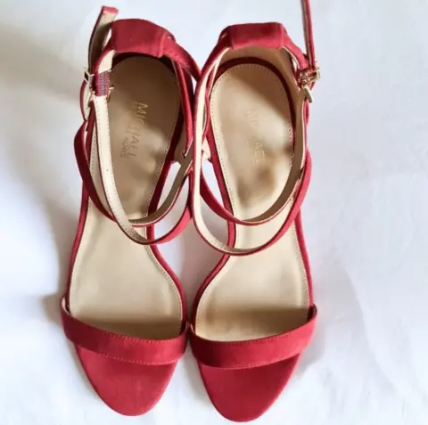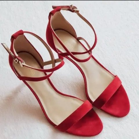 Sandalias Michael Kors. Hermosas sandalias color scartlet efecto ante, tacón de 8 cm. De aguja. Con cinta cruzada en el tobillo.Incluye caja. Etiqueta en la suela