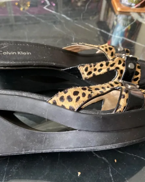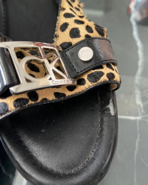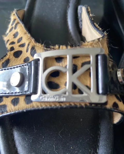 Sandalias negras Calvin Klein. Sandalias de plataforma negras con tipo piel de leopardo, o animal print, tiene 2 detalles se muestran en fotografías, no se nota ya puestos