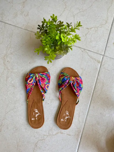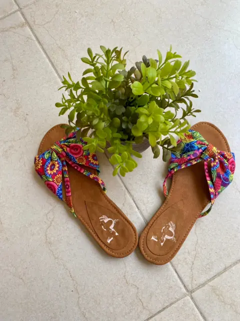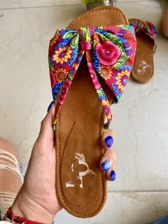 Súper cómodas sandalias planas, diseño floreado, ideal para temporadas y climas calurosos, el corte es tela y la plantilla es de gamuza sintética, la suela es antiderrapante considerar que del empeine viene angosto por el diseño. Nuevas y en buen estado.
