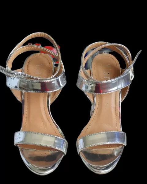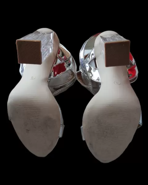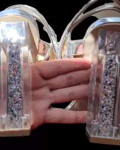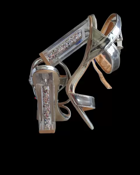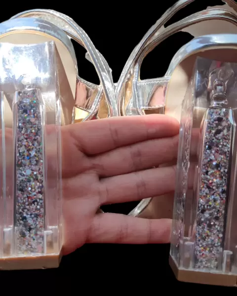 Preciosas sandalias de color plata, tacon 12cm transparente en forma de rectangulo con relleno en brillantina multicolor (solo use 1 vez)