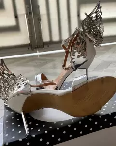Sandalias plateadas con tacón. Sandalias plateadas con mariposa trasera, un solo uso. Sin detalles