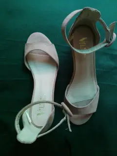 Sandalias color rosa Vline, talla 3, imitación gamuza, tacón cuña, alto 5 cm., correa de tobillera, detalle de hebilla circular.