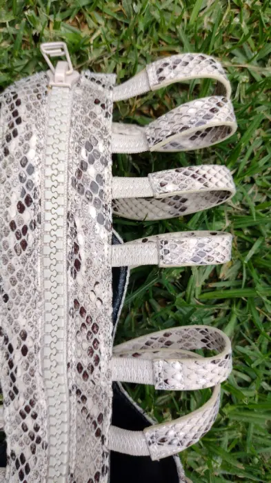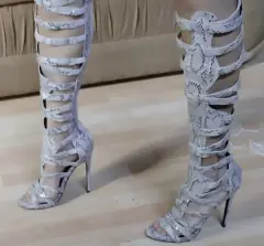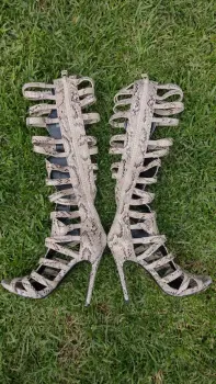 Sandalias de gladiador snakeskin rodilla de tacón alto.* Punta abierta*Tacón de aguja. (12 cm)*Cierre con cremallera trasera con tiras.Las últimas 3 tiras de arriba se expanden un poco, tenen elástico.TACONES EXACTOS, NO ROTOS, NO CHUECOS.PUESTO UNA SOLA VEZ