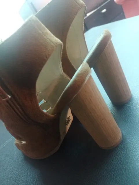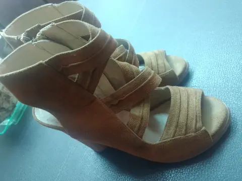 Hermosas sandalias color camel, piel gamuza, tacón circular alto, cierre posterior, súper combinables. ¡Dales una segunda oportunidad! También disponible en paquete con falda del mismo tono y tipo de tela.