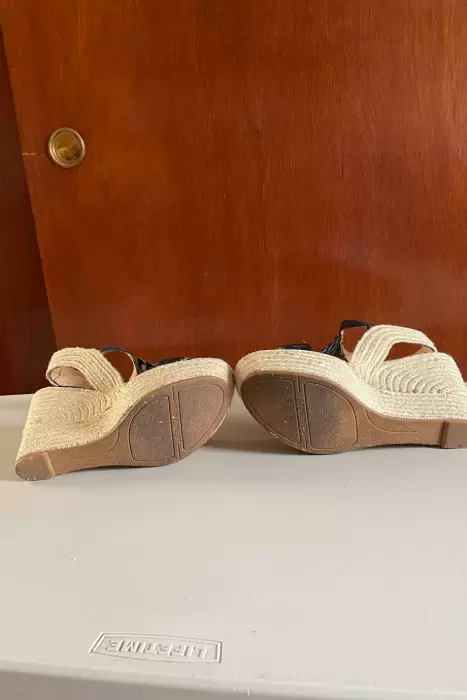 Sandalias Wedge NegrasSuper lindas para usar en época de calorMarca Nine WestColor Negro con plataforma de yuteTalla 5.5 Usa 8.5Tacón altura 12 cmPlataforma altura 4 cmComodidad 10 de 10 *Detalles en el interior por el uso y por el tiempo que en nada disminuyen su funcionalidad. Se está descarapelando el interior consecuencia de tenerlos guardados, por eso los pongo a la venta, ya no los uso.