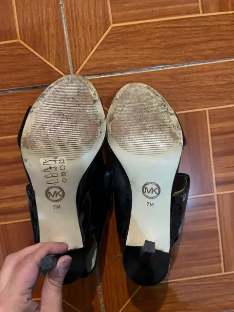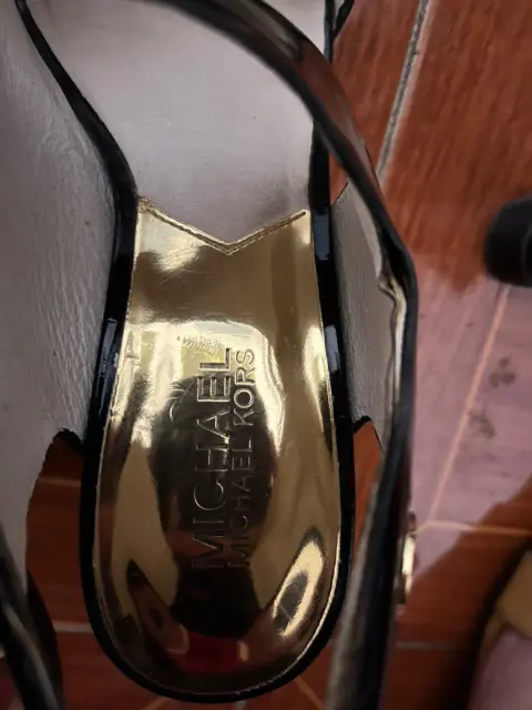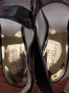 Lindas zapatillas mk con emblema talla 4 de charol negro, detalle en la correa como se muestra en la segunda y tercera foto