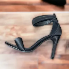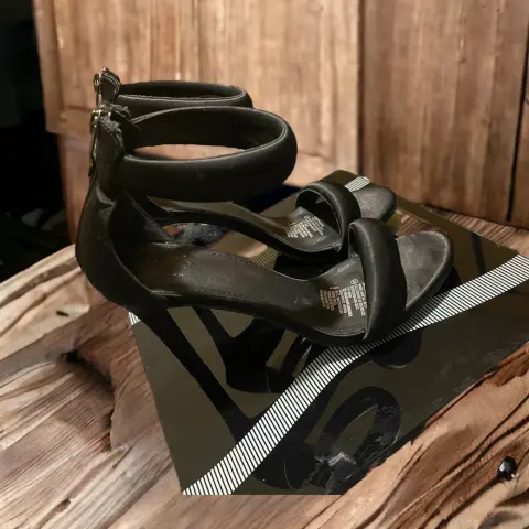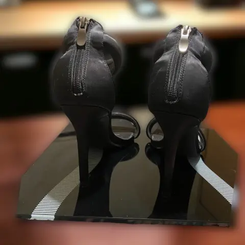 Zapatillas negras lisas satinadas. Talon con pulsera, Tacón delgado (11cm de alto) Horma redonda, Forradas con tela tipo satin. En excelente estado (solo un par de puestas) en las fotos se aprecia el buen estado de la suela y las tapas