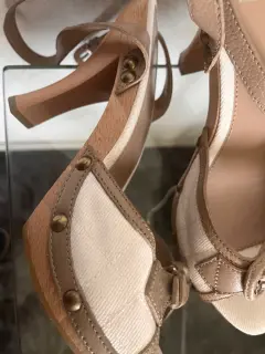 Son unas zapatillas originales, nuevas, realizadas en madera y piel, color nude, talla 41 europeo - 27 mexicano