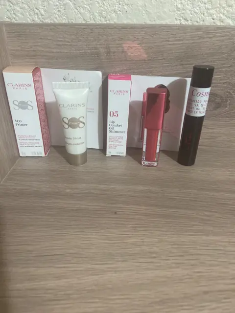 Cosmetiquera con 3 minis: SOS primer (10 ml), Lip confort oil shimmer tono 05 pretty in pink (1.5 mL), lash and brow Double Fic mascara (3 mL, fijador de cejas). Incluyere llavero de la marca