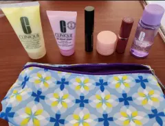 Estuche Clinique. Mini estuche con diferentes artículos entre ellos un labial, rimel, desmaquillante, limpiador de piel, gel para control de grasa y contorno de ojos, ideal para viajar