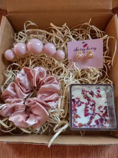 Cajita con regalos bonitos contiene una scrunchy de satín, unos aretes tejidos a mano, una vela aromática, y una pinza, da regalos especiales