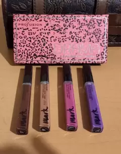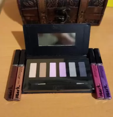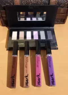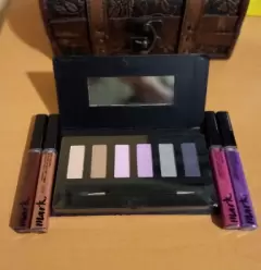 Kit de maquillaje. Sombras en tonos frescos y cálidos, y 4labiales de larga duración mate en tonos vino pasión, violeta, morado y beige.