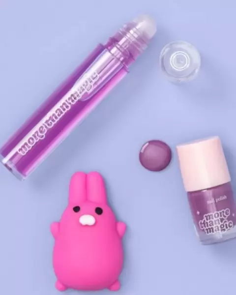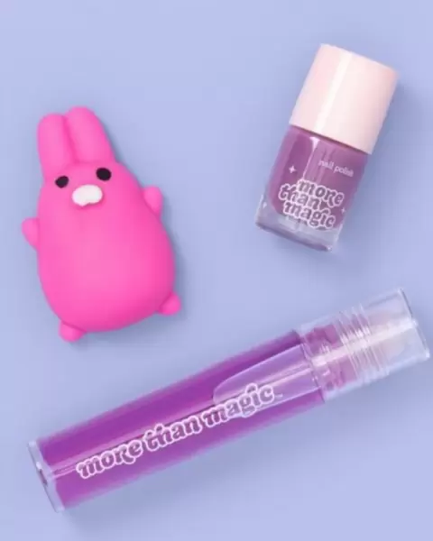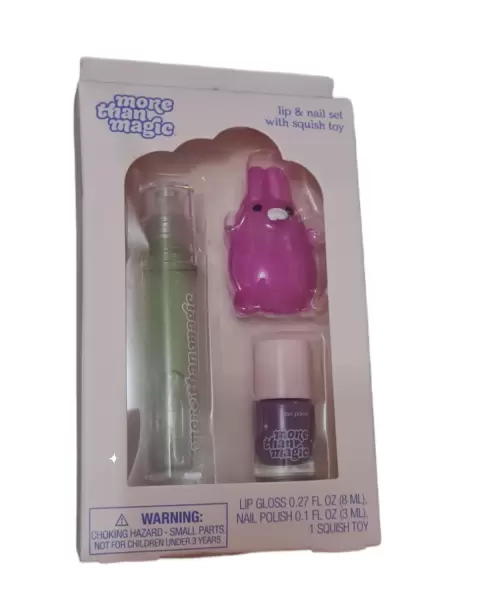 SET DE 3 PIEZAS MARCA MORE THAN MAGIC,INCLUYE 1 GLOSS SIN COLOR DE 8 ML,1 BARNIZ DE POLISH DE 3 ML COLOR MORADO Y 1 SQUISHY FIGURA CONEJA,INCLUYEN 2 SET