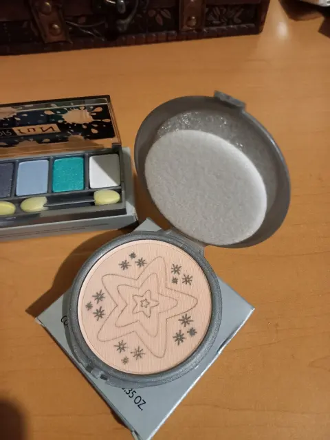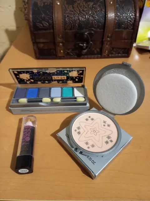 Set de maquillaje. Contiene paleta decdombras tonos frios, pollo compactocon destellos plata, labial mágico color al tacto con tus labios dependiendo tu pH.