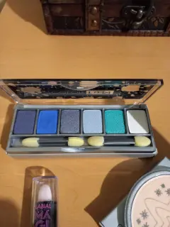 Contiene paleta decdombras tonos frios, pollo compactocon destellos plata, labial mágico color al tacto con tus labios dependiendo tu pH.