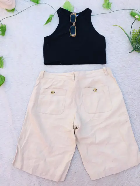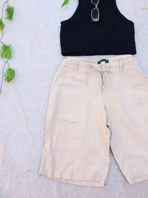 BERMUDA DE LINO BEIGE. 💖🛍 BERMUDA DE LINO BEIGE🛍💖✨Talla 4 Banana 🍌 republic mide 39 cm de cintura 50 cm de cadera 20 cm de tiro 50 cm de largo es de la ligera lino no transparenta tiene cintas en la cintura para ajustar y cierre