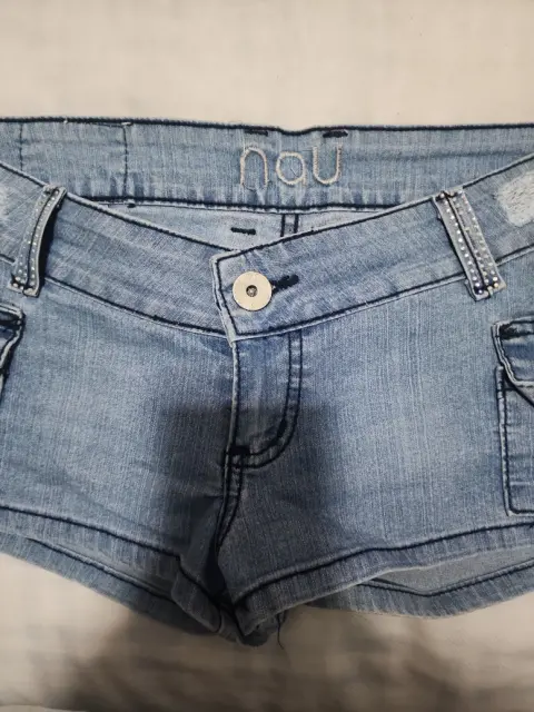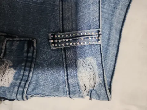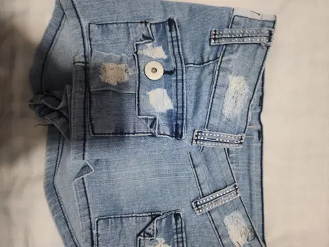 Mini short de mezclilla con detalles degastados, dos bolsas en los laterales y en las pretinas del cinturón con brillitos
