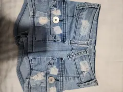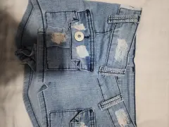 Mini short de mezclilla. Mini short de mezclilla con detalles degastados, dos bolsas en los laterales y en las pretinas del cinturón con brillitos