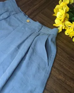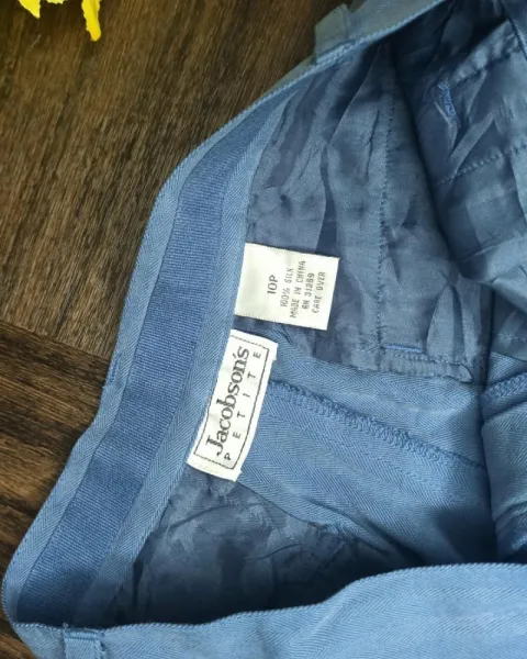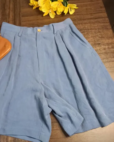 Mom short jacobson's 100% seda. Mom short azul, mide 36 de cintura aproximadamente talla s igual te puedo pasar mas medidas si gustas, es 100% sedaOjo: La etiqueta dice talla 10 pero viene muy reducido de cintura por eso puse la medida en la última foto .. puede quedar a una talla S o M pero checar bien las medidas.La primer foto es de referencia de como luce puesto el tipo de modelo, no es mia