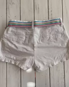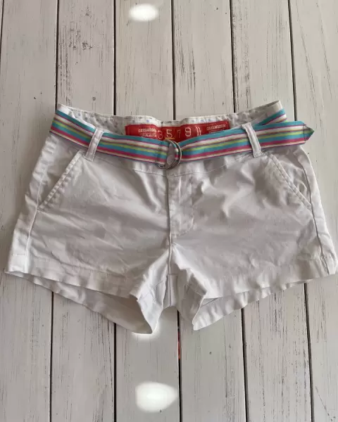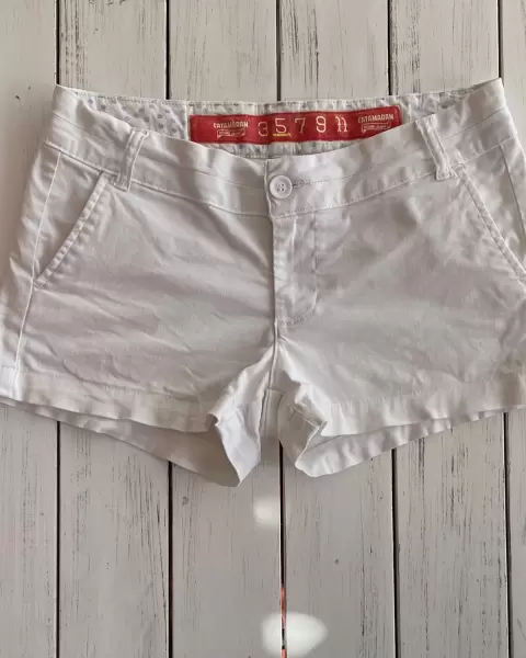 Short corto blanco, stretch y ajusta a la cadera (así lo usé), tiene bolsillos laterales y traseros.Talla: 5 Medidas: 39 de cintura, 41 de cadera, 20 de tiro y 32 de largo.Dónde está la talla está deslavado.