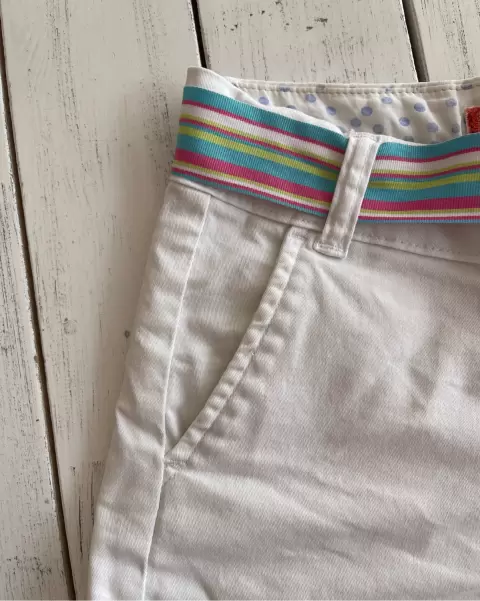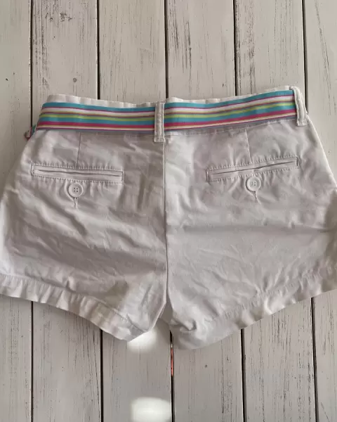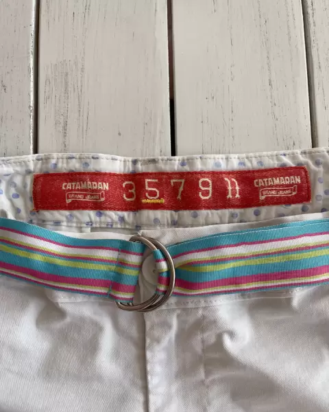 Short corto blanco Catamarán. Short corto blanco, stretch y ajusta a la cadera (así lo usé), tiene bolsillos laterales y traseros.Talla: 5 Medidas: 39 de cintura, 41 de cadera, 20 de tiro y 32 de largo.Dónde está la talla está deslavado.