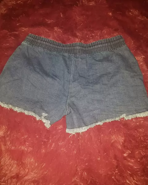 Short de mezclilla corto. Con resorte y lazo en cintura, tiene bolsas a los lados El color del short es del color mezclilla del elastico de la foto 3. De cintura mide 42. De cadera 53 y de largo 31 cm. Es stretch