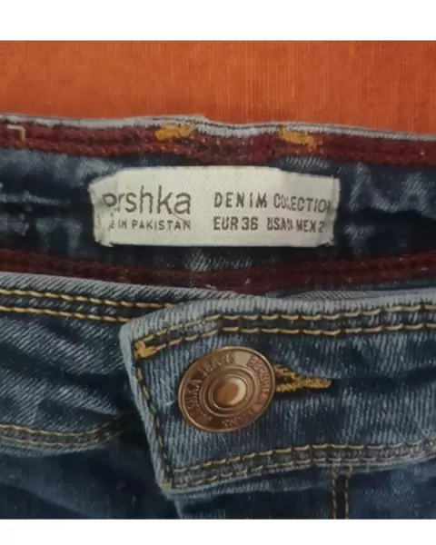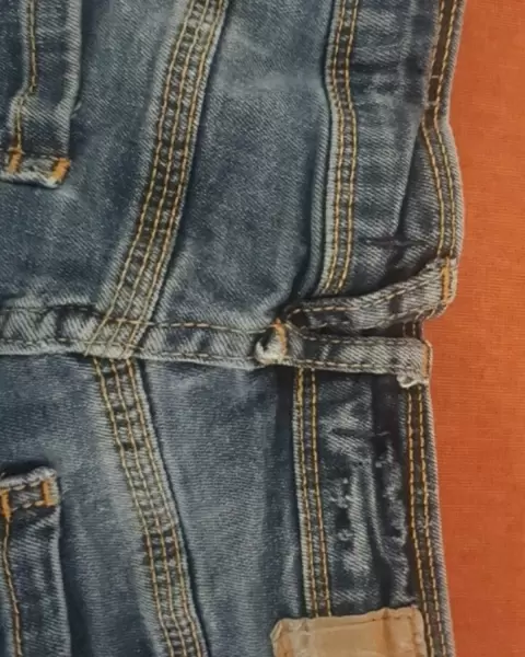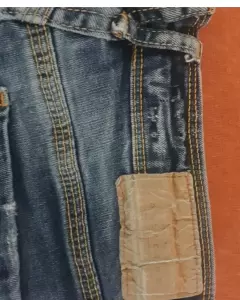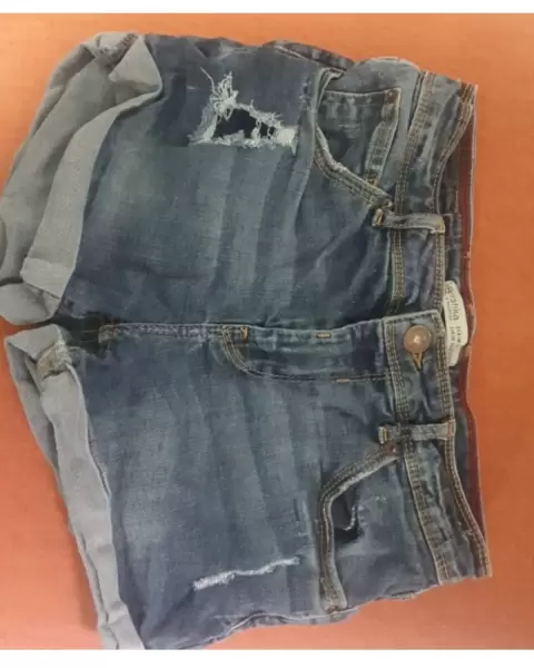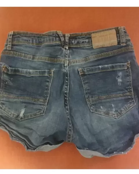 Short de mezclilla corto. Short que tiene desgastes en las piernas y en la parte de atras, asi venia desde el principio . El unico detalle que tiene es de la etiqueta de atrasnque esta un poco desgastadas,