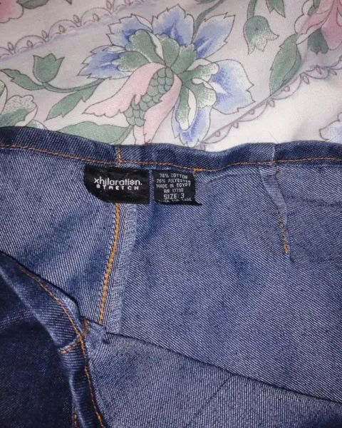 Short de mezclilla delgada, corto, sin bolsas, con cierre a un lado, rígido, costuras cafés, muy bonito!!!