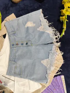 Short demin azul claro, corto con destrucciones. botones al frente para abrochar. 4 bolsillos (2 adelante y 2 traseros). Rígido, no stretch, Talla 11. Tiro alto.