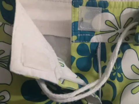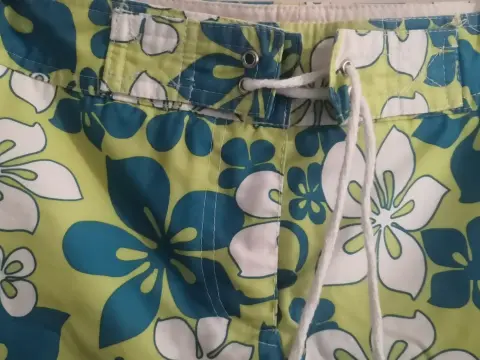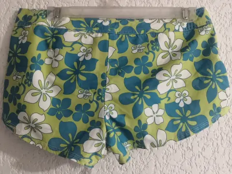 Short Floral azul y verde. Marca Lob. Talla 2 qué sería una mediana. Velcro como botón, cierre y jareta. Ideal para usarlo arriba del traje de baño y salida de alberca y playa. Desgaste normal