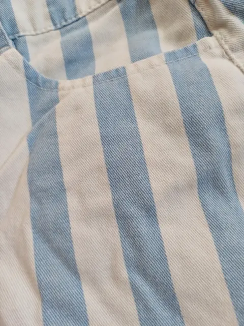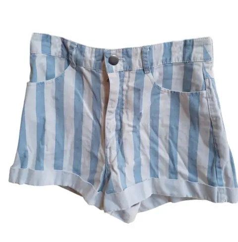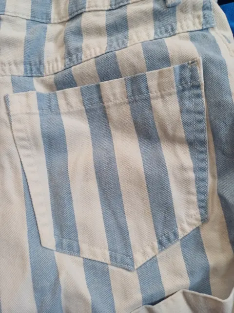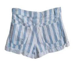 Short Rayado. Short Corto de mezclilla de rayas verticales blancas y azul claro, con un doblés en la parte inferior, tiene bolsas en la parte frontal y trasera, con botón frontal color pateado en la parte central, marca forever 21, talla extra chico (xs), en perfecto estado.