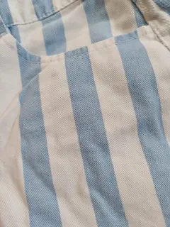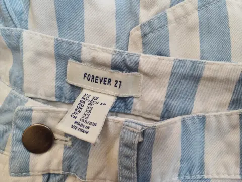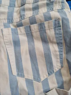Short Corto de mezclilla de rayas verticales blancas y azul claro, con un doblés en la parte inferior, tiene bolsas en la parte frontal y trasera, con botón frontal color pateado en la parte central, marca forever 21, talla extra chico (xs), en perfecto estado.