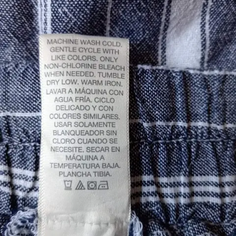 Short rayado con bolsas. Short veraniego, rayado gris con rayas blancas, tiene resorte en la cintura en la parte trasera, 55% Lino, 45% rayon