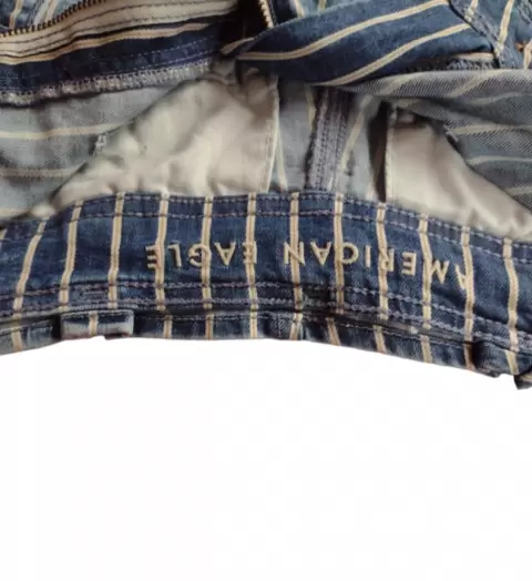 Shorts de mezclilla con rayas blancas, listón en la cintura, talla S marca American Eagle.