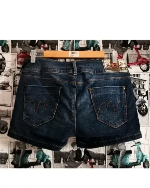 Shorts de mezclilla deslavado ligeramente. Cintura baja. Muy corto de las piernas.