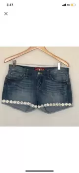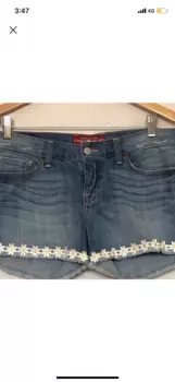 Shorts de mezclilla con flores. Shorts de mezclilla desgastados y con flores en las orillas de abajo en la parte del dobladillo.