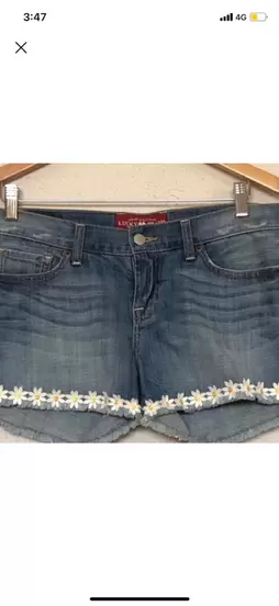 Shorts de mezclilla desgastados y con flores en las orillas de abajo en la parte del dobladillo.