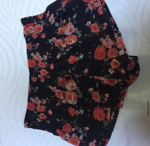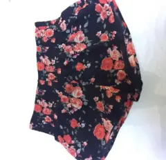 Shorts florales negro en poliéster, ideal para el verano caluroso, doble fondo. Piernas semi olgado, con hilo elástico en cintura para mayor comodidad. Talla: M. Marca: FOREVER 21.