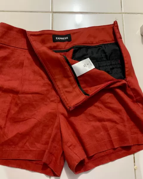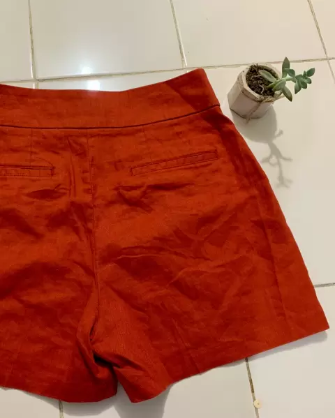 Shorts ladrillo tiro alto. Talla 2, cintura alta. Sin detalles, están preciosos✨ 35 cm cintura (fija), 46.5 cm cadera (estiran un poco) y 33 cm largo.
