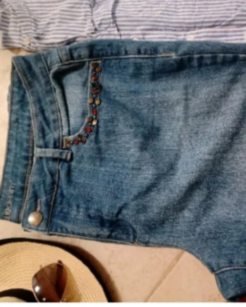 Shorts mezclilla. Bonito detalle de piedras y estoperoles en las bolsas delanteras.MedidasCintura 48 cmCadera 58 cmLargo de pierna 52 cm
