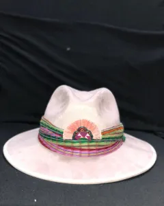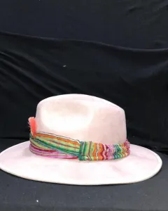 Sombrero en color rosa pastel con una vi tulla de colores y una pequeña placa