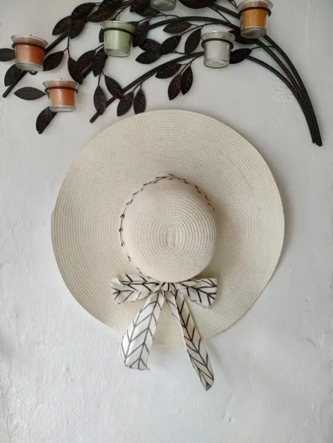 Sombrero color beigeCon un lindo liston en tonos cafésIdeal para cubrir del sol de una manera eleganteSin detallesUsado una vezMide 46 cm de diámetro20 cm de diámetro en dónde va la cabeza