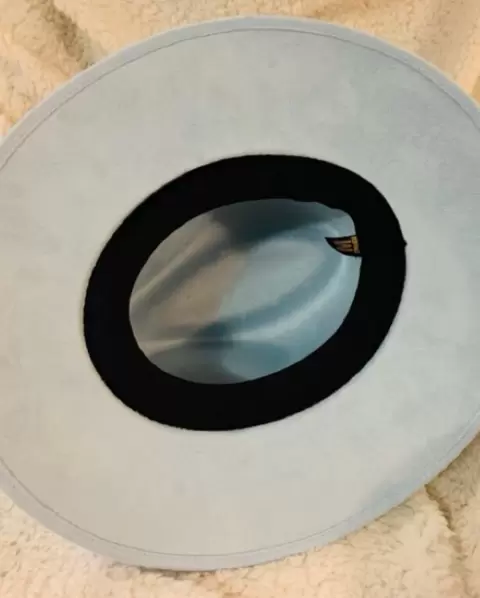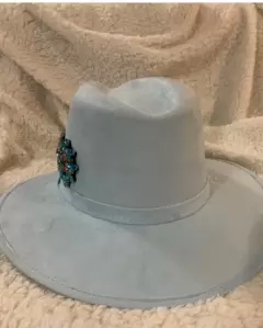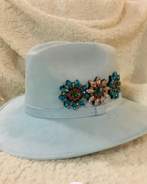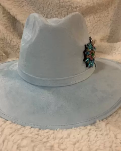 SOMBRERO PEDRERÍA. Color azul pastel, con pedrería a un costado, talla M, nuevo, de gamuza
