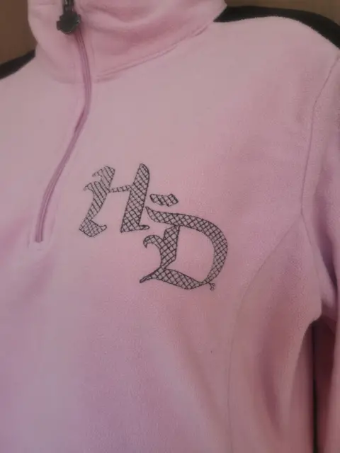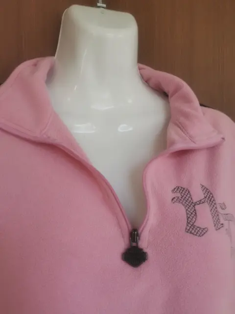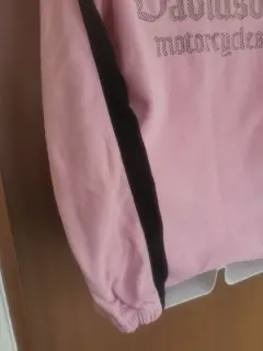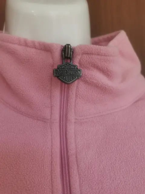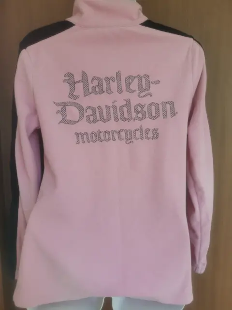 Chamarra Harley Davidson color rosa con franja negra en las mangas. Bordado de la marca en el lado izquierdo y medio cierre en la parte frontal. Bordado sutil en la parte trasera Super calientita