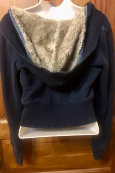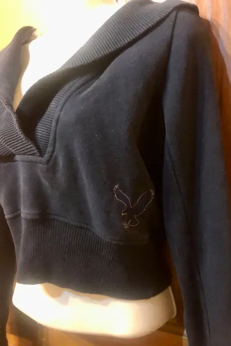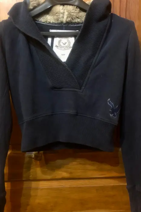 Hoodie corta azul marino, de la marca American Eagle Outfitters, talla chica, con gorrito afelpado, prenda trendy ideal para clima frío moderado. 80% algodón, 20%poliester. Calientita y ligeramente suave.