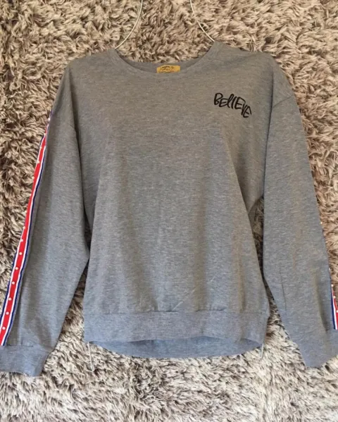 Maxi sudadera. ✨Luce como Ariana Grande; sudadera en color gris, manga larga detalle de lineas en azul, rojo y blanco y con perlas. y cuello redondo. UNITALLA ✔️Si esta publicado esta disponible ♻️Envio en cajas recicladas ‼️Sí es tu primera compra en la aplicacion utiliza mi codigo “OjosTapatioswqypc” y te regalo $100 pesos!