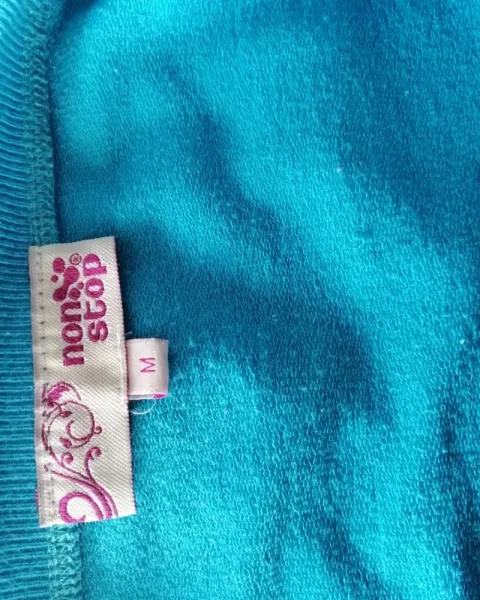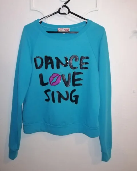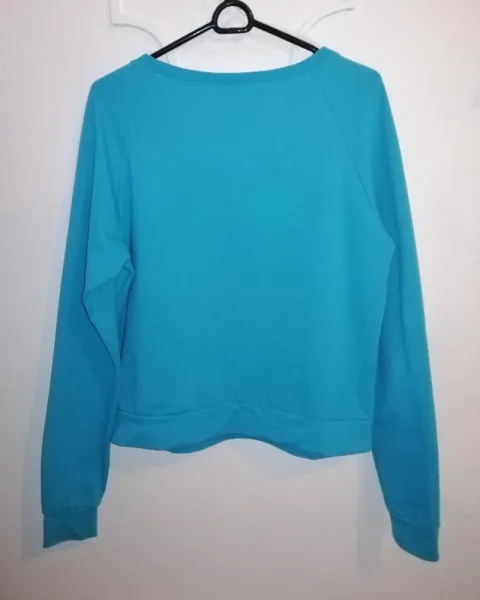 Sudadera color azul con estampado de letras negras, talla mediana. Es ligera y está en buenas condiciones pero tiene una pequeña mancha en frente como se ve en la última foto