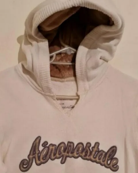 SUDADERA BEIGE AEROPOSTALE!! AFELPADA!. PADRISIMA SUDADERA ALGODON Un poco mas grueso ,afelpado!! gorro afelpado con peluche !! Letras bordadas,prenda Original.De medio uso en excelente estado!!!BEIGE HERMOSO.MUY BUENA CALIDAD!! talla : S/M