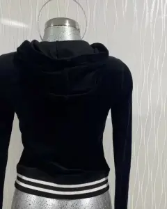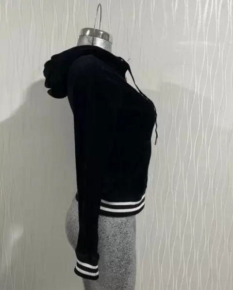 Tela tipo terciopelo, con capucha, cierre dorado, bolsillos frontales