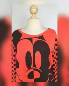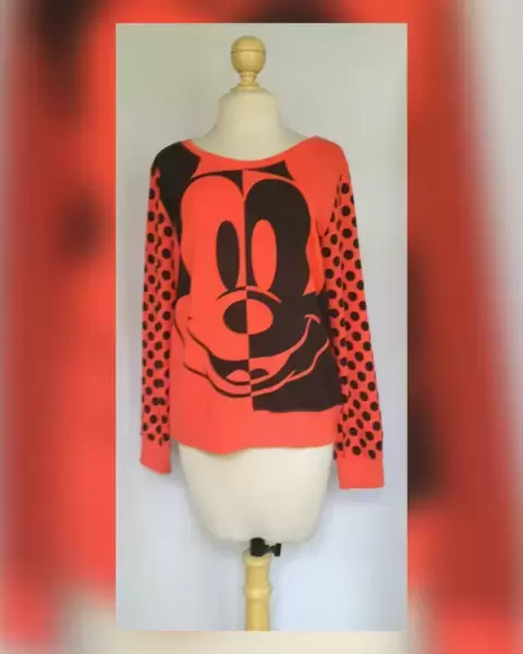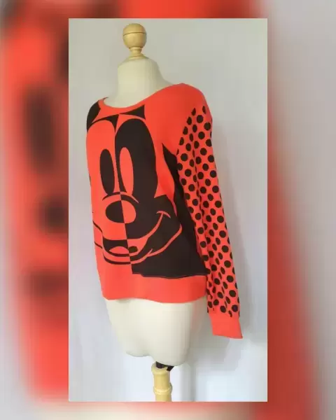 Sudadera bitono CORAL INTENSO/NEGRO ÉBANO, estampado frontal Mickey Mouse, cuello redondo, mangas polka dots y forro interior dry fit. TALLA EEG (REDUCIDA, da mejor a G/EG). Dimensiones cms: 43 hombro, 57 axila, 53 zona baja, 58 largo, 68 largo manga. 48% poliéster, 48% viscosa, 4% elastano. Para lavado en casa.